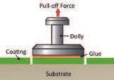 Conociendo el diámetro del carro de prueba, la fuerza de rotura se convierte en una tensión de rotura (resistencia) expresada en megapascales (MPa) o libras por pulgada cuadrada (psi). Un MPa equivale a 14 psi. Para estas pruebas se suele utilizar un comprobador de adhesión portátil, comúnmente llamado Equipos PULL OFF, que suele cumplir con normas como la ASTM D4541.1 El usuario registra la resistencia al arranque, así como la ubicación de la rotura en el sistema de recubrimiento (por ejemplo, una falla de adhesión entre la imprimación y el sustrato o entre capas, cohesión dentro de una capa de recubrimiento, falla del adhesivo, etc.). La versión 2017 de la ASTM D4541 incluía un protocolo alternativo de aprobado/reprobado, en el que la fuerza se incrementa solo hasta un límite predeterminado y la prueba se da por finalizada, minimizando, si no evitando, los daños al recubrimiento.