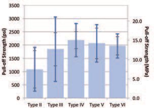En la versión de 2009 de la norma ASTM D4541, se determinó la resistencia al arranque de cuatro paneles pintados utilizando cinco dispositivos en una encuesta interlaboratorio. Las lecturas promedio de la resistencia al arranque determinadas con cada tipo se muestran en la Figura 2. Los límites de repetibilidad y reproducibilidad de la Tabla 1 indican la diferencia porcentual máxima aceptable entre los resultados antes de que se consideren significativos. Repetibilidad para un solo operador con un solo dispositivo y reproducibilidad entre diferentes operadores. Estos también se representan como barras de error en la Figura 2, con los límites de repetibilidad como los valores menores. Estos límites son significativos e indican que los resultados de las pruebas obtenidos por estos dispositivos están sujetos a una incertidumbre considerable, un problema también discutido por Schilling. Por ejemplo, si un operador obtiene un resultado de 7 MPa (1000 psi) con un medidor Tipo II bajo condiciones dadas, entonces un segundo resultado bajo condiciones diferentes debe ser menor que (7- [7 x .65]) = 2.5 MPa (360 psi) o mayor que (7+ [7 x .65]) = 11.6 MPa (1680 psi) para que el cambio se considere significativo. Incluso con el medidor más repetible, el Tipo IV, un resultado tendría que estar fuera del rango de 6-8 MPa (870 1160 psi) para considerarse significativo. Al comparar los resultados con los obtenidos por otros operadores, la dispersión esperada de los resultados será aún mayor. Es claro que las pequeñas diferencias en los valores de extracción dentro o entre investigaciones, especialmente los valores más altos, no deben considerarse significativas.