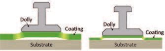 La prueba de arranque es un método para determinar cuantitativamente la fuerza de adhesión de un recubrimiento a un sustrato. Se fija un dispositivo de carga (comúnmente llamado dolly) a la superficie del recubrimiento con un adhesivo, como se muestra en la Figura 1. A continuación, el aparato de prueba se fija al dolly y se alinea para tirar del dispositivo de carga perpendicularmente a la superficie del recubrimiento. La fuerza se incrementa gradualmente hasta que el dispositivo de carga se desprenda, lo que ocurrirá en la interfaz más débil dentro del sistema de recubrimiento.