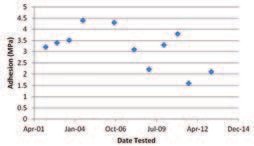 El Sarraf et al. describieron cómo se utilizan los valores de adhesión al desprendimiento para determinar los programas de mantenimiento del Puente del Puerto de Auckland en Nueva Zelanda. La inspección del estado del recubrimiento se realiza a intervalos regulares e incluye pruebas de desprendimiento en varios lugares. Las pruebas iniciales se realizaron con un medidor Tipo III, que posteriormente se cambió a una Tipo V, que, como se mencionó anteriormente, debería arrojar resultados comparables. La experiencia ha determinado que un valor mínimo de 2,5 MPa es un nivel de desprendimiento aceptable para permitir la aplicación de un nuevo recubrimiento sin riesgo de delaminación del recubrimiento existente. Aunque el valor promedio de resistencia al desprendimiento en la mayoría de los sitios resultó ser aceptable, de 5 MPa, la Figura 6 muestra los resultados de un sitio con valores bajos. Si bien la dispersión es considerable, la tendencia a la baja sugiere que el recubrimiento está perdiendo resistencia y que la región requiere mayor investigación antes de repintarla. De hecho, la región resistió un lavado con agua a 4000 psi y se repintó con éxito. Los autores del estudio indicaron a este autor que las pruebas recientes de resistencia al desprendimiento en este sitio han arrojado valores muy superiores al límite de 2,5 MPa.