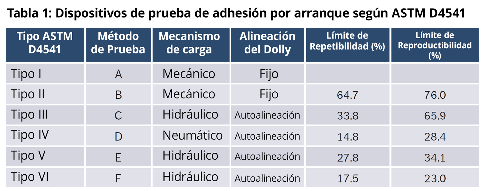 La norma ASTM D4541 reconoce esto y divide los dispositivos en diferentes tipos, cada uno con su propio método de prueba, como se muestra en la Tabla 1. Los calibres de Tipo I se utilizan generalmente para hormigón y se eliminaron de la norma en 2004, aunque el dispositivo sigue estando disponible.