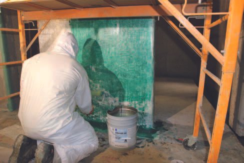 Tras el chorreado del hormigón para crear una superficie limpia para el revestimiento, los ingenieros del proyecto sabían que la humedad sería un problema para la aplicación del revestimiento, ya que las cuencas adyacentes seguían en uso y llenas de agua. Por lo tanto, la humedad podría filtrarse a través del hormigón en al menos una pared de cada cuenca en reparación, lo que podría generar problemas de adherencia. El equipo solucionó este problema aplicando por pulverización una resina epoxi bicomponente de curado rápido en las paredes de la cuenca. La membrana superficial tolera la humedad residual del hormigón y sirvió para bloquear la humedad a su superficie, lo que permitió su restauración. También ayuda a prevenir el desprendimiento del sistema de revestimiento causado por la humedad.