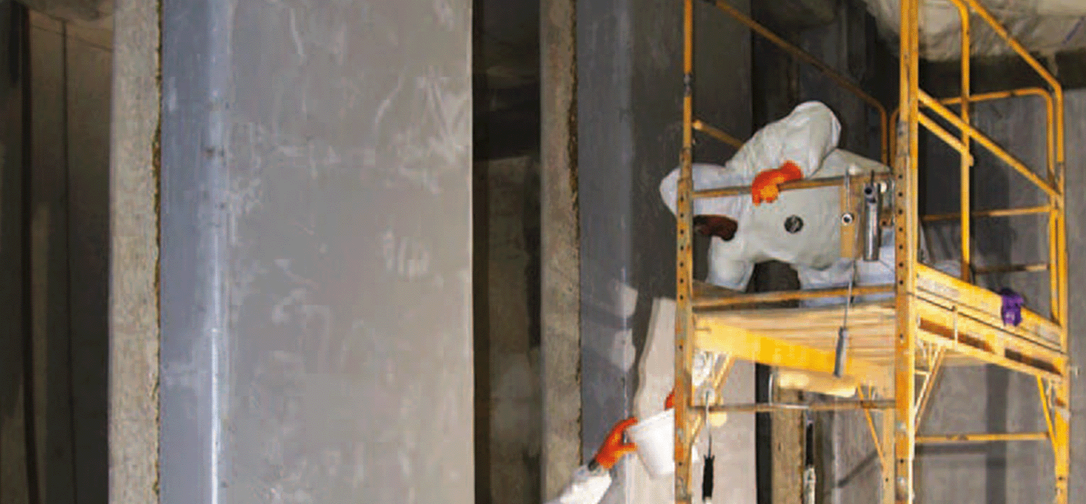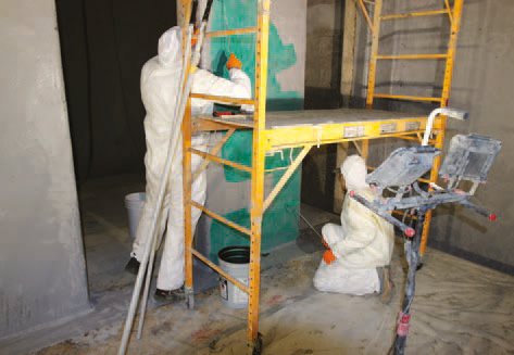 FIG. 1: Para restaurar las paredes de hormigón deterioradas de las cuencas MBR de JBWRF, los aplicadores utilizaron un compuesto de reparación y revestimiento de epoxi con 100 % de sólidos, reconstruyendo las superficies a su plano original.
