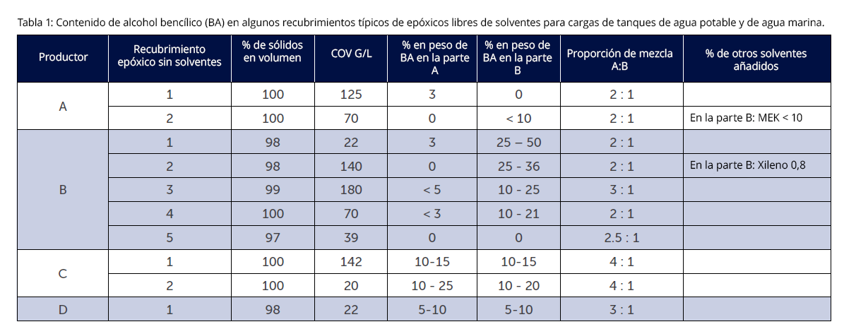 En la Tabla 1, el contenido de alcohol bencílico en la base epoxi y el agente de curado de los recubrimientos epoxi sin disolventes para tanques marinos se ha obtenido de las fichas de datos de seguridad de los fabricantes de recubrimientos. De la tabla se desprende claramente que no todos los fabricantes de pintura consideran el alcohol bencílico como un disolvente que aumenta el contenido de COV y reduce los sólidos volumétricos del recubrimiento. Por lo tanto, nos encontramos con la desafortunada situación de que los recubrimientos sin disolventes, que deberían tener un contenido de sólidos volumétricos muy cercano al 100 % y 0 g/l de COV, pueden variar entre el 95-100 % de sólidos y 0-180 g/l de COV. Considerando que los recubrimientos epóxicos de ultra alto contenido de sólidos pueden tener hasta un 97 % de sólidos volátiles (VS) y hasta 50 g/l de COV, es necesario establecer una definición común y universal de epoxi sin disolventes para que los usuarios puedan distinguir claramente entre recubrimientos epóxicos sin disolventes y de ultra alto contenido de sólidos. Además, las principales ventajas de los recubrimientos epóxicos sin disolventes son sus bajas o nulas emisiones de COV, la posibilidad de aplicar películas gruesas con poca o ninguna contracción y una menor tensión de formación de película. En base a esto, los autores proponen la siguiente definición universal para un recubrimiento epóxico sin disolventes: