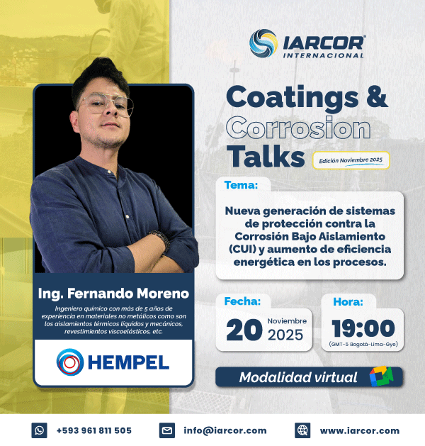 Durante la sesión, se analizarán las causas, consecuencias y afectaciones que la CUI genera en sectores como oil & gas, energía, industria química, alimenticia, papelera y textil, entre otros. Asimismo, se expondrán las principales normativas internacionales recomendadas para su control, junto con soluciones innovadoras que integran protección anticorrosiva y mejora térmica en una sola aplicación.
