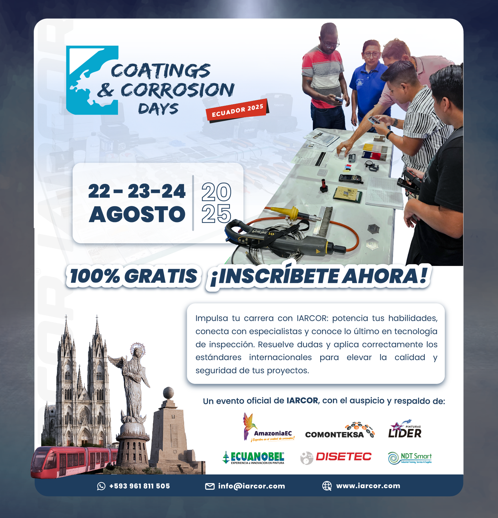 El Coatings & Corrosion Weekend llega a Quito como un evento técnico intensivo de tres días, dirigido a profesionales y estudiantes del sector industrial interesados en profundizar sus conocimientos en preparación superficial, aplicación de recubrimientos protectores y control de calidad.