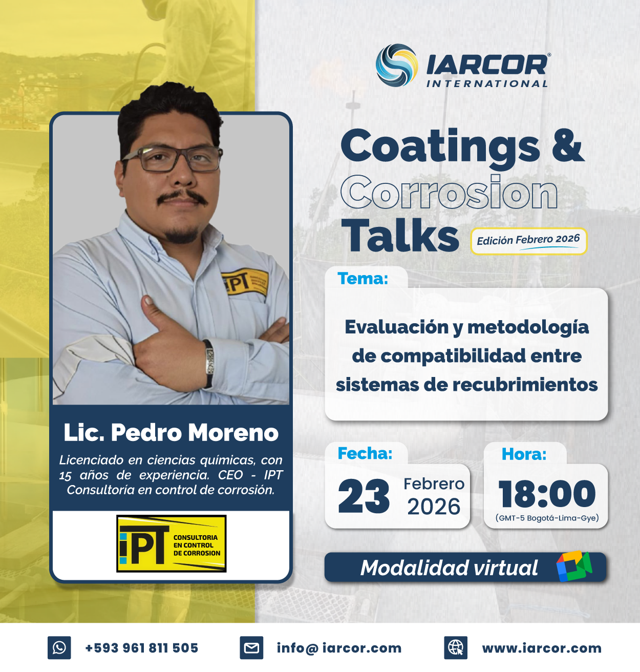 Este webinar abordará la evaluación técnica y analítica de la compatibilidad entre sistemas de recubrimientos utilizados en procesos de mantenimiento industrial, un aspecto crítico para garantizar el desempeño, la durabilidad y la confiabilidad de los sistemas de protección anticorrosiva.